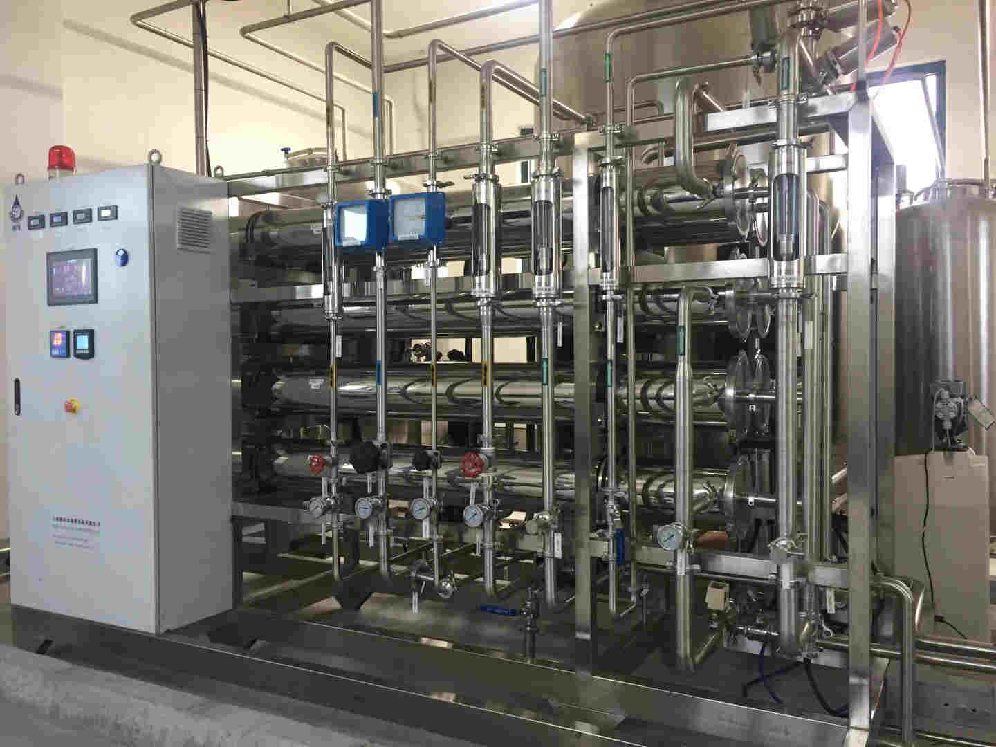 原水→原水泵→多介質過濾器→活性炭過濾器→軟水器→精密過濾器→一級高壓泵→一級反滲透→中間水箱→二級高壓泵→二級反滲透→EDI泵→EDI系統→拋光樹脂→氮封水箱→用水點